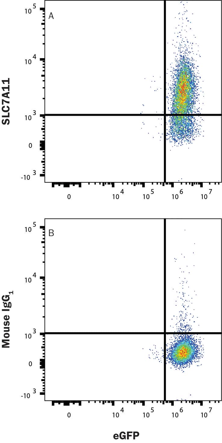 HEK293 human embryonic kidney cell line transfected with human xCT/SLC7A11 and eGFP was stained with (A) Mouse Anti-Human xCT/SLC7A11 Monoclonal Antibody (Catalog # MAB11251) or (B) Mouse IgG1 control antibody staining (MAB002) followed by Allophycocyanin-conjugated Anti-Mouse IgG Secondary Antibody (F0101B). View our protocol for Staining Membrane-associated Proteins.