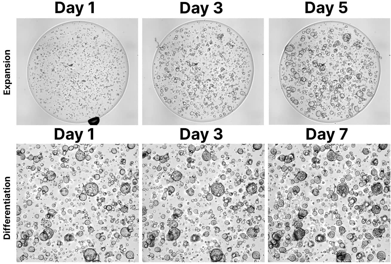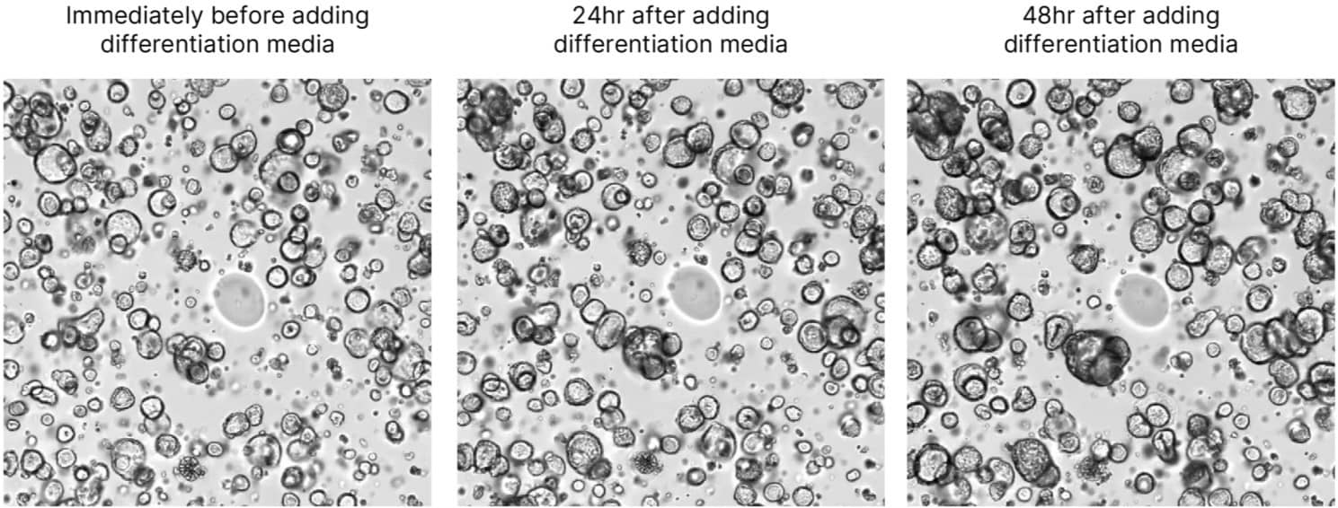 Organoids expanded in Cultrex Synthetic Hydrogel exhibit expected cystic morphology, indicative of healthy baseline development. Upon differentiation, the organoids begin to lose their cystic morphology and start forming more specialized, structured tissues. This demonstrates the ability of Cultrex Synthetic Hydrogel to support both healthy initial organoid growth and subsequent differentiation into mature structures.
