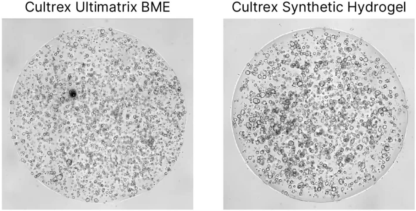 Cultrex UltiMatrix BME (Catalog # BME001-05) domes were plated at 10,000 cell per 10 μL hydrogel, and Cultrex Synthetic Hydrogel (Catalog # CSH-RUO) domes were plated at 15,000 cells. After three days in culture, comparable organoid growth is observed.