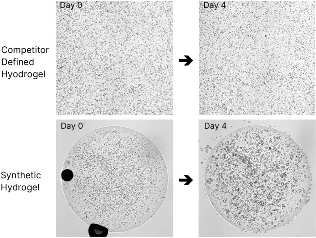 Successful organoid growth observed in Cultrex Synthetic Hydrogel (Catalog # CSH-RUO-01) while organoids encapsulated in a competitor's defined hydrogel showed failed organoid formation and significant cell death by day 4.