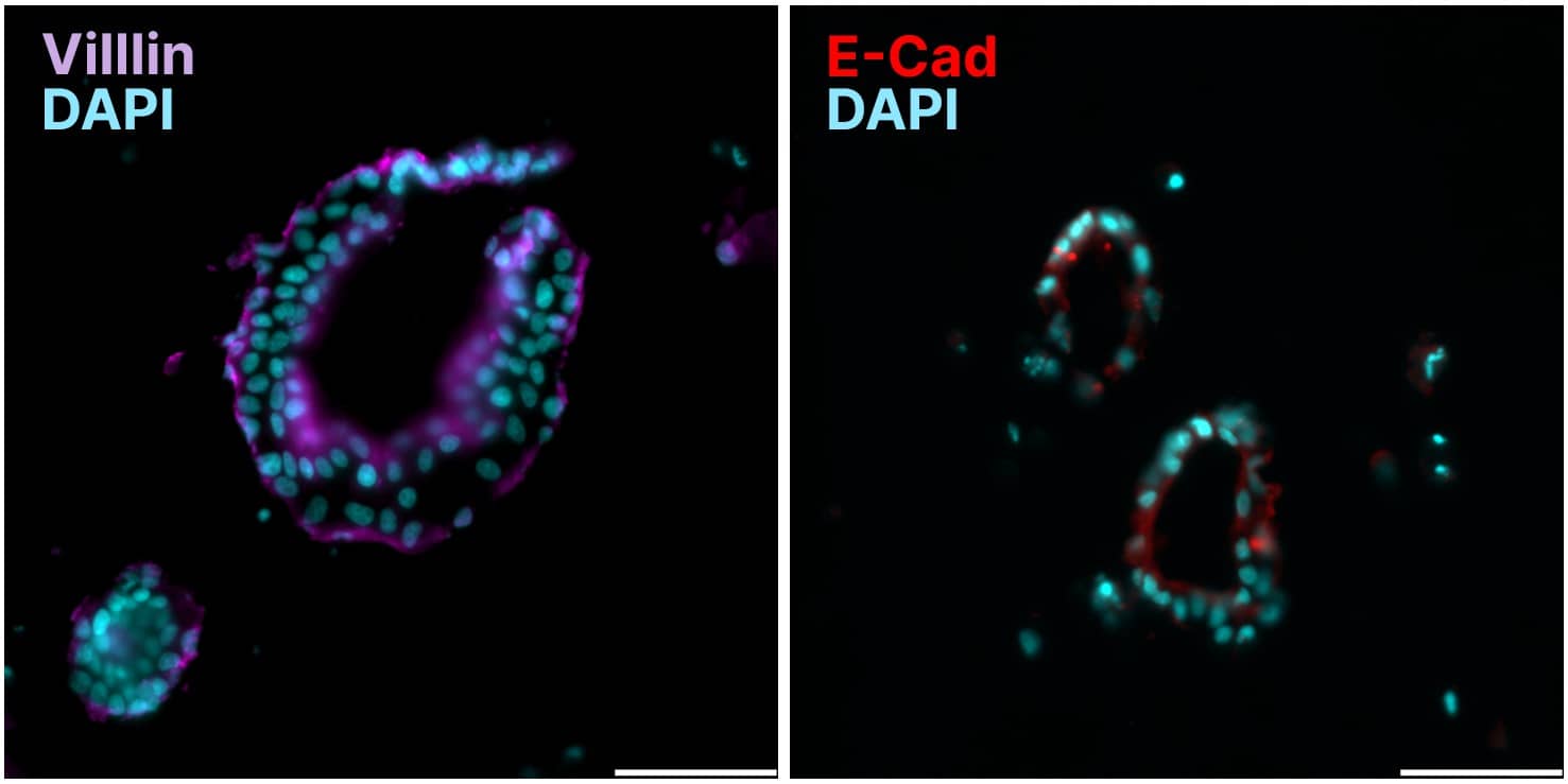 Images of human enteroids expanded with Wnt/RSPO2 (Catalog # BT-WRSP2) in Cultrex Synthetic Hydrogel (Catalog # CSH-RUO-01), with quantification of total organoid area on day 4. ICC images of enteroids stained with Villin (Catalog # NBP2-75707), E-Cadherin (Catalog # AF748) and DAPI in Synthetic Hydrogel. Scale bar indicates 50 µm.