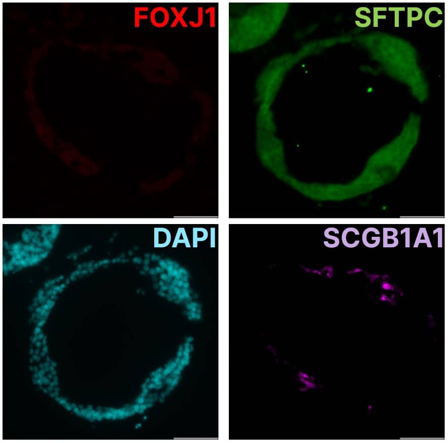 Lung organoids grown with FGF-10 HS (Catalog # BT-FGF10HS) in Cultrex Synthetic Hydrogel (Catalog # CSH-RUO-01). Sections of lung organoids (cultured for 25 days) in Synthetic Hydrogel with FGF-10 HS stained for SFTPC, SCGB1A1, FOXJ1 (Catalog # AF3619), and DAPI. Scale bar indicates 50 µm.