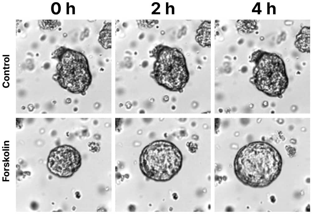 Enteroids cultured in Wnt/RSPO2 (Catalog # BT-WRSP2) and Synthetic Hydrogel (Catalog # CSH-RUO-01) were differentiated for 7 days and then exposed to Forskolin (10 µM, Catalog # 1099) or DMSO (control) to assess the function of mature CFTR-expressing secretory cells (e.g. enterocytes). The presence of Forskolin led to organoid swelling whereas control did not change in size. Scale bar indicates 100 µm.