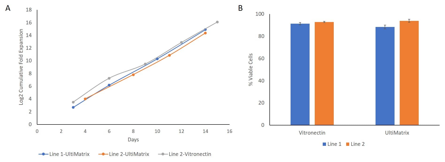 Different human iPSC lines maintained in ExCellerate™ iPSC Expansion Medium showed minimal line-to-line variability in cumulative fold expansion over 15 days (A) and exhibit greater than ~90% viability after 4 days in culture (B). Graph is displayed as average ± standard deviation. Cell lines were cultured on Cultrex™ UltiMatrix (Catalog # BME001), Recombinant Human Vitronectin (Catalog # 2308-VN).