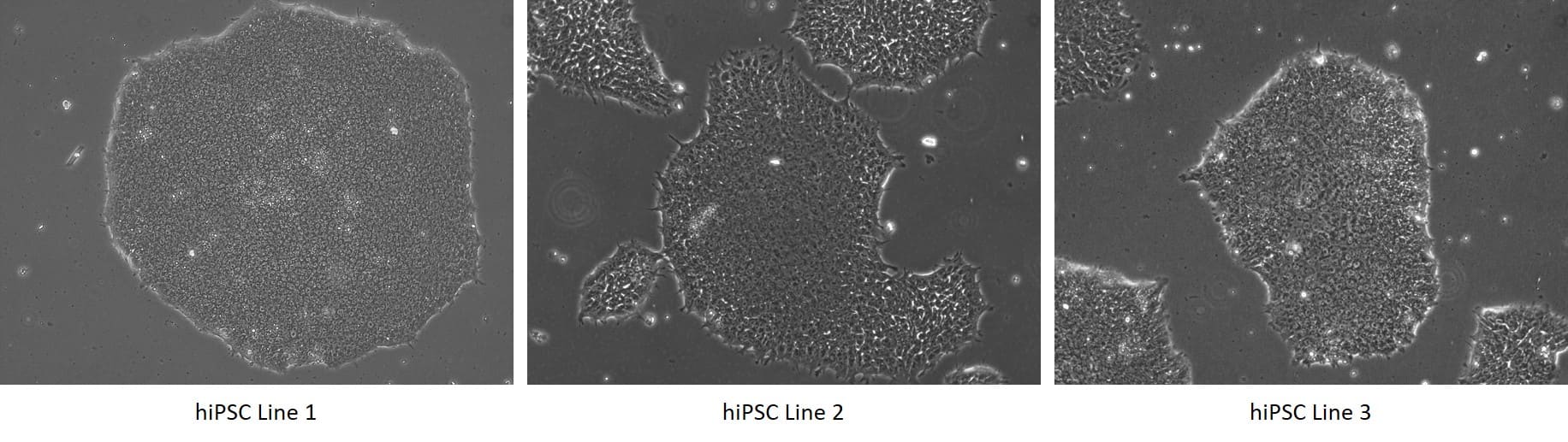 Different hiPSC lines grown using Cultrex UltiMatrix (Catalog # BME001) and cultured in ExCellerate™ iPSC Expansion Medium show healthy rounded colony morphology and characteristics such as compact cells and clearly defined smooth colony edges.