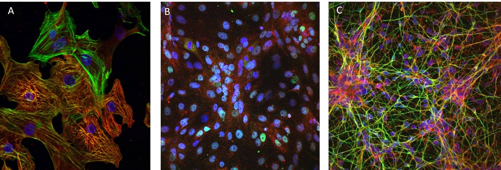 HiPSCs maintain their pluripotency in ExCellerate™ iPSC Expansion Medium and can differentiate into cells of the three germ layers (Catalog # SC027B). Shown here are images of hiPSC derived cardiomyocytes (mesoderm, Catalog # SC032B) expressing cardiac troponin T (cTNT1, red, Catalog # MAB1874), F-actin (green) and DAPI (blue, Catalog # 5748) (A); hepatocytes (endoderm, Catalog # SC033) showing expression of albumin (red, Catalog # MAB1455), HNF4a (green, Catalog # PP-H1415) and DAPI (blue) (B); and neurons (ectoderm, Catalog # SC035) expressing N-cadherin (red), Tuj1 (green) and DAPI (blue)(C). Cells were grown using Cultrex UltiMatrix (Catalog # BME001).
