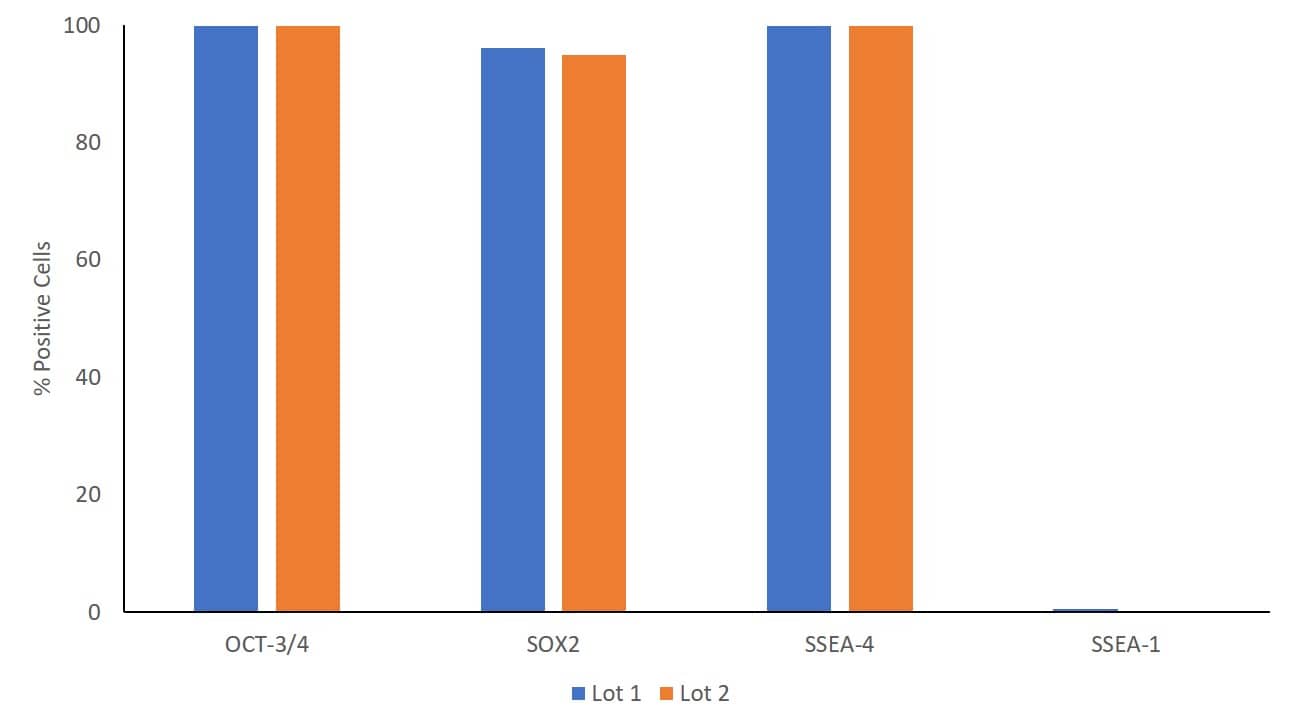Human iPSC lines grown using Cultrex UltiMatrix (Catalog # BME001) and cultured in different lots of ExCellerate™ iPSC Expansion Medium express high levels of undifferentiated stem cell markers OCT-3/4, SOX2, SSEA-4 and no SSEA-1 as assessed flow cytometry (Catalog # FMC001).