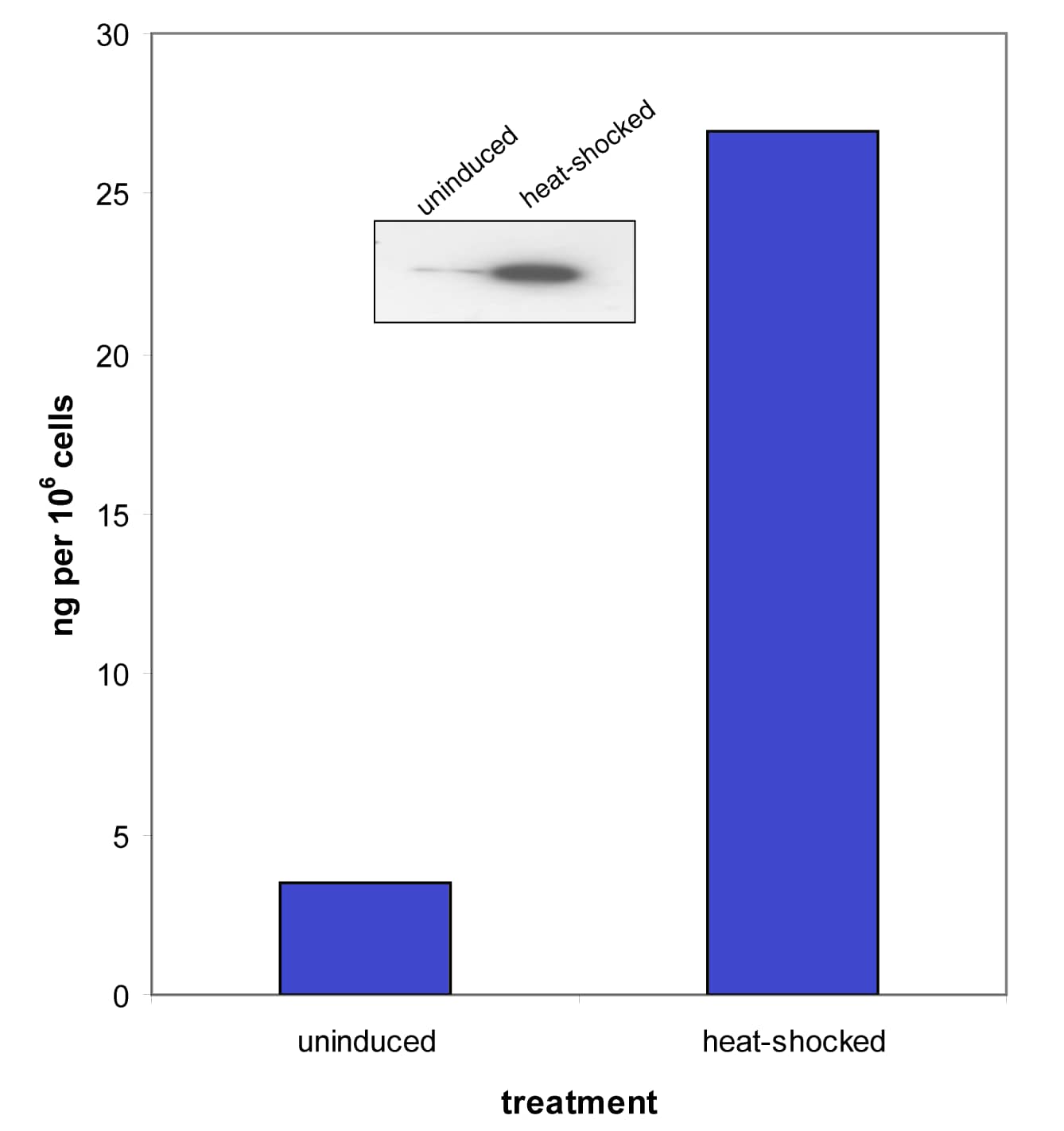 Jurkat cells were heat-shocked at 44ºC for 30 mins and allowed to recover for 4 hrs at 37 ºC. Following cell lysis, HSP-70 was quantified with the DuoSet IC. The same lysates were also immunoblotted (inset) with Rb anti-HSP-70 (R&D Systems, Catalog # AF1663) antibody. The DuoSet IC results correlate well with the amounts of HSP-70 detected by Western blot.