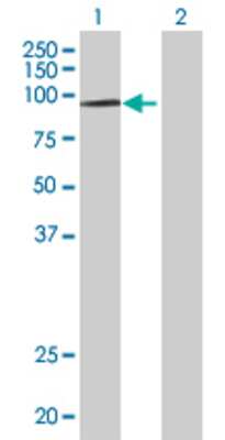 Lane 1: HIRA transfected lysate (111.8 KDa) Lane 2: Non-transfected lysate.