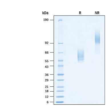 2 μg/lane of Recombinant Cynomolgus Monkey/Rhesus Macaque NKG2D/CD314 Fc Chimera Protein (Catalog # 10960-NK) was resolved with SDS-PAGE under reducing (R) and non-reducing (NR) conditions and visualized by Coomassie® Blue staining, showing bands at 45-65 kDa and 90-130 kDa, respectively.
