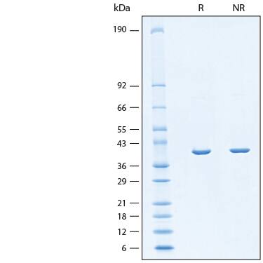 2 μg/lane of Recombinant H. pylori Fucosyltransferase Protein (Catalog # 11072-GT) was resolved with SDS-PAGE under reducing (R) and non-reducing (NR) conditions and visualized by Coomassie® Blue staining, showing bands at 39 kDa.Formulation, Preparation and Storage
