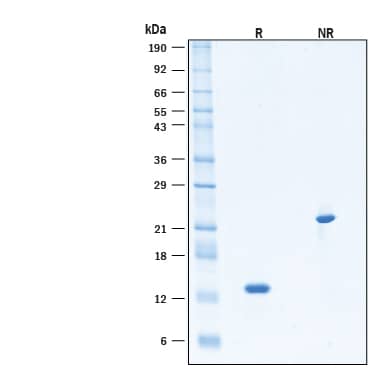 2 μg/lane of Recombinant Human Activin A (CHO derived) Protein (Catalog # 11348-AC) was resolved with SDS-PAGE under reducing (R) and non-reducing (NR) conditions and visualized by Coomassie® Blue staining, showing bands at 13 and 24 kDa respectively.