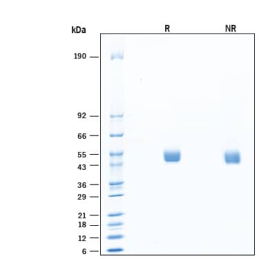 2 μg/lane of Recombinant Human alpha‑Galactosidase A/GLA Protein (Catalog # 6146-GH) was resolved with SDS-PAGE under reducing (R) and non-reducing (NR) conditions and visualized by Coomassie® Blue staining, showing bands at 45-55 kDa.Formulation, Preparation and Storage