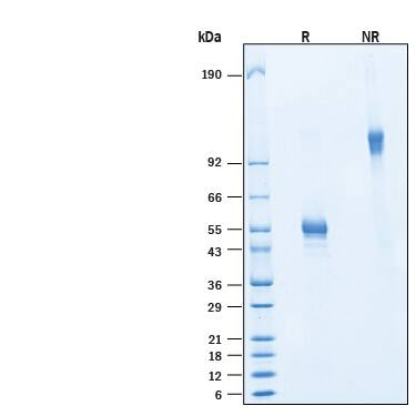 2 μg/lane of Recombinant Human CD160 Fc Chimera Protein (Catalog # 11575-CD) was resolved with SDS-PAGE under reducing (R) and non-reducing (NR) conditions and visualized by Coomassie® Blue staining, showing bands at SDS-PAGE 39-59 kDa and 80-120 kDa, respectively.Formulation, Preparation and Storage