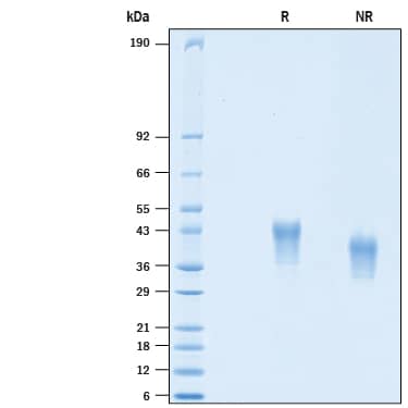 2 μg/lane of Biotinylated Recombinant Human CD25/IL-2R alpha His-tag Avi-tag (Catalog # AVI10305) was resolved with SDS-PAGE under reducing (R) and non-reducing (NR) conditions and visualized by Coomassie® Blue staining, showing bands at 36-51 kDa.Formulation, Preparation and Storage
