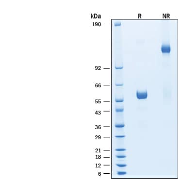 2 μg/lane of Biotinylated Recombinant Human CD8 alpha Fc Chimera Protein (Catalog # BT10927) was resolved with SDS-PAGE under reducing (R) and non-reducing (NR) conditions and visualized by Coomassie® Blue staining, showing bands at 52-64 kDa and 100-130 kDa, respectively.