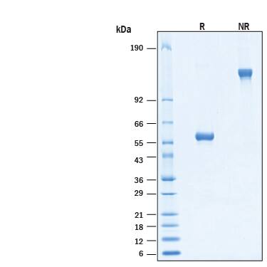 2 μg/lane of Biotinylated Recombinant Human CD8 alpha Fc Chimera Avi-tag Protein (Catalog # AVI10927) was resolved with SDS-PAGE under reducing (R) and non-reducing (NR) conditions and visualized by Coomassie® Blue staining, showing bands at 55-61 kDa and 110-120 kDa, respectively.Formulation, Preparation and Storage