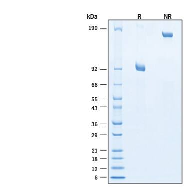 2 μg/lane of Biotinylated Recombinant Human DLL4 Fc Chimera Protein (Catalog # BT10185) was resolved with SDS-PAGE under reducing (R) and non-reducing (NR) conditions and visualized by Coomassie® Blue staining, showing bands at 83-98 kDa and 170-200 kDa, respectively.Formulation, Preparation and Storage