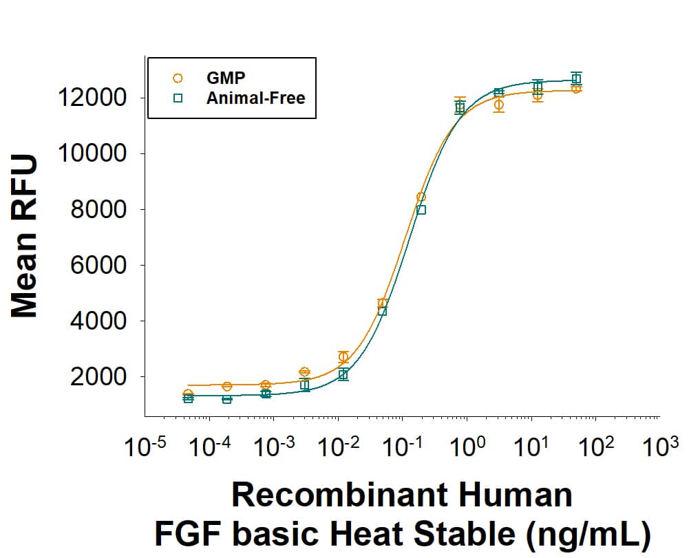 The bioactivity of Recombinant Human FGF basic Heat Stable GMP Protein (Catalog # BT-FGFBHS-GMP) was measured in a cell proliferation assay using NR6R-3T3 mouse fibroblast cell line. The ED50 for this effect is 0.0500-0.600 ng/mL. Three independent lots were tested for bioactivity and plotted on the same graph to show lot-to-lot consistency of GMP FGF basic/FGF2 Heat Stabile protein.Equivalent bioactivity of GMP and Animal-Free grades of recombinant human FGF basic heat-stable proteins.
