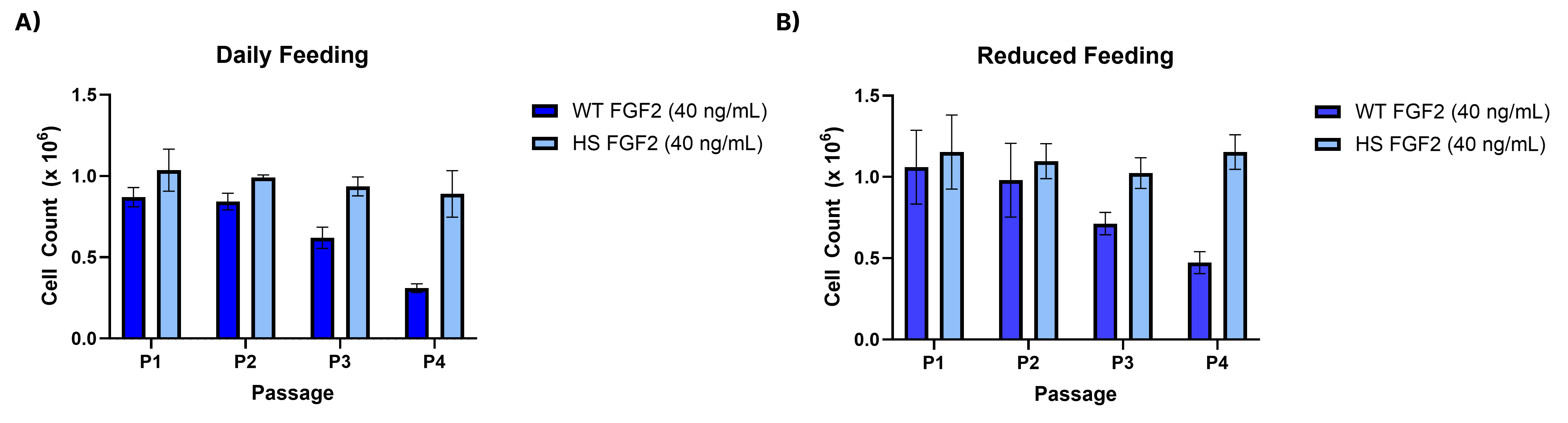Human iPSCs were cultured for four passages in a commercial iPSC Expansion media containing 40 ng/mL of either rhFGFb Heat Stable (BT-FGFBHS) or wild type rhFGFb, Animal-Free (BT-FGFB-AFL). Media exchanges were performed following two feeding schedules. A). a daily feed schedule or B). a reduced feed schedule, where cells were double fed twice per week. Cells were plated at 5000 cells/cm2in a 6-well dish coated with Cultrex Ultimatrix (BME001). For each schedule, all conditions were passaged once either group reached ~60-70% confluency and counts were performed using a Cellaca™ High-Throughput Cell Counter. Count of each passage is shown comparing WT vs HS FGFb in both the A) daily feed or B) reduced feed schedule.Formulation, Preparation and Storage