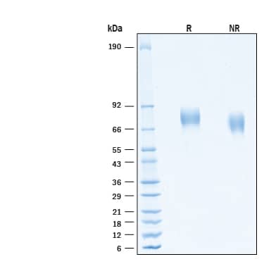2 μg/lane of Recombinant Human FGFR1 alpha (IIIc) His-tag Protein (Catalog # 11118-FR) was resolved with SDS-PAGE under reducing (R) and non-reducing (NR) conditions and visualized by Coomassie® Blue staining, showing bands at 70-85 kDa.