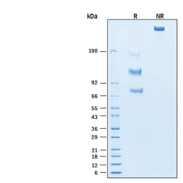 2 μg/lane of (Catalog # 11655-GR) was resolved with SDS-PAGE under reducing (R) and non-reducing (NR) conditions and visualized by Coomassie® Blue staining, showing bands at 160-180 kDa, 110-125 kDa and 70-80 kDa, under reducing conditions.Formulation, Preparation and Storage