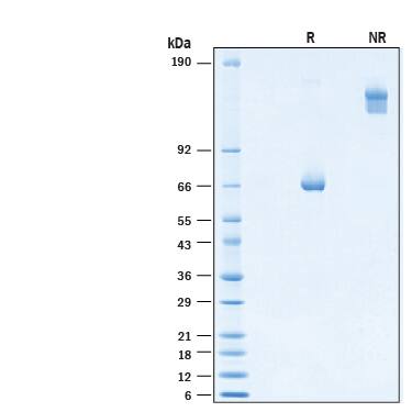 2 μg/lane of Biotinylated Recombinant Human IL-2 R beta Fc Chimera Avi-tag Protein (Catalog # AVI10919) was resolved with SDS-PAGE under reducing (R) and non-reducing (NR) conditions and visualized by Coomassie® Blue staining, showing bands at 60-70 kDa and 120-140 kDa, respectively.
