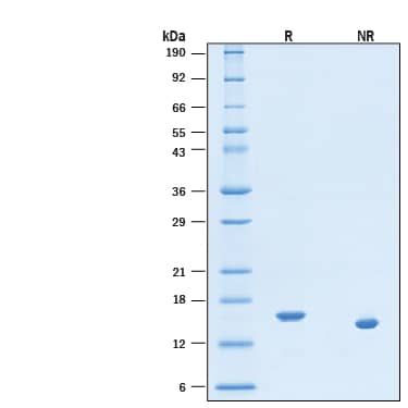 2 μg/lane of Recombinant Human IL-21 GMP Protein (Catalog # BT-021-GMP) was resolved with SDS-PAGE under reducing (R) and non-reducing (NR) conditions and visualized by Coomassie® Blue staining, showing bands at 15-17 kDa, under reducing conditions.