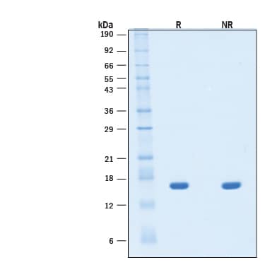 2 μg/lane of Recombinant Human IL‑21 (HEK293 Expressed) Protein (Catalog # 11393-IL) was resolved with SDS-PAGE under reducing (R) and non-reducing (NR) conditions and visualized by Coomassie® Blue staining, showing bands at 15-17 kDa, under reducing conditions.Formulation, Preparation and Storage