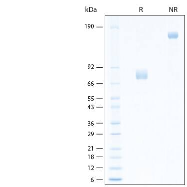 2 μg/lane of Recombinant Human IL-22BP Fc Chimera Avi-tag Protein (Catalog # AVI1087) was resolved with SDS-PAGE under reducing (R) and non-reducing (NR) conditions and visualized by Coomassie® Blue staining, showing bands at 73-82 kDa and 146-164 kDa, respectively.Formulation, Preparation and Storage