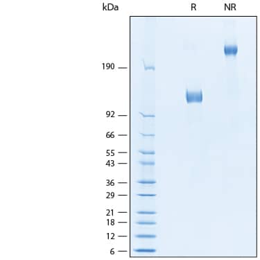 2 μg/lane of Recombinant Human IL-31RA Fc Chimera Protein (Catalog # 11028-IL) was resolved with SDS-PAGE under reducing (R) and non-reducing (NR) conditions and visualized by Coomassie® Blue staining, showing bands at 114-131 kDa and 130-160 kDa, respectively.Formulation, Preparation and Storage