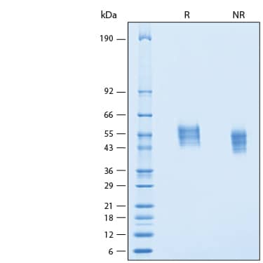 2 μg/lane of Recombinant Human IL1RAPL2 His-tag Protein (Catalog # 11207-MR) was resolved with SDS-PAGE under reducing (R) and non-reducing (NR) conditions and visualized by Coomassie® Blue staining, showing bands at 40-60 kDa.