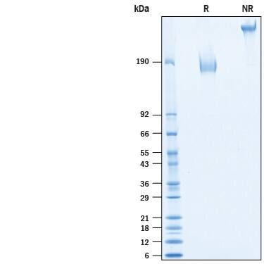 2 μg/lane of Biotinylated Recombinant Human MUC-1 Fc Chimera Avi-tag (Catalog # AVI10332) was resolved with SDS-PAGE under reducing (R) and non-reducing (NR) conditions and visualized by Coomassie® Blue staining, showing bands at 168-195 kDa and 320-380 kDa, respectively.Formulation, Preparation and Storage