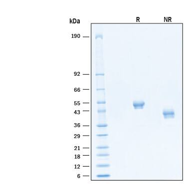 2 μg/lane of Biotinylated Recombinant Human Nectin‑2/CD112 His-tag Avi-tag Protein (Catalog # AVI2229) was resolved with SDS-PAGE under reducing (R) and non-reducing (NR) conditions and visualized by Coomassie® Blue staining, showing bands at 43-55 kDa.Formulation, Preparation and Storage