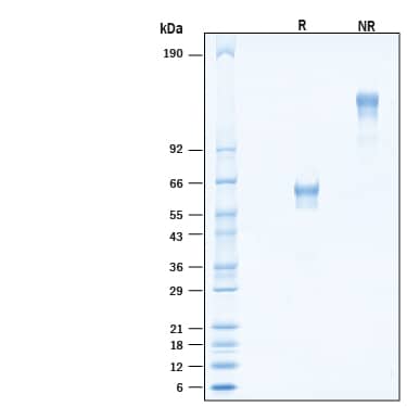 2 μg/lane of Recombinant Human PILR-beta Fc Chimera Avi-tag Protein (Catalog # AVI9828) was resolved with SDS-PAGE under reducing (R) and non-reducing (NR) conditions and visualized by Coomassie® Blue staining, showing bands at 55-68 kDa.Formulation, Preparation and Storage