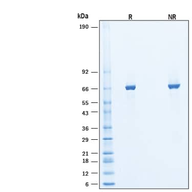 2 μg/lane of Recombinant Human POR/Cytochrome P450 Reductase His-tag Protein (Catalog # 6340-PRB) was resolved with SDS-PAGE under reducing (R) and non-reducing (NR) conditions and visualized by Coomassie® Blue staining, showing bands at 63-69 kDa, under reducing conditions.Formulation, Preparation and Storage