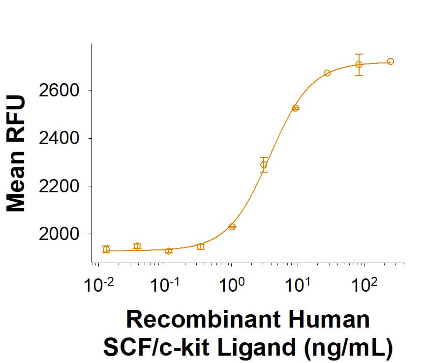 Recombinant Human SCF/c kit Ligand (Catalog # BT-SCF) stimulates cell proliferation of the TF-1 human erythroleukemic cell line. The ED50 for this effect is 1.00-8.00 ng/mL.Equivalent Bioactivity of GMP, Animal-Free, and RUO grades of Recombinant Human SCF.