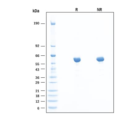 2 μg/lane of Recombinant Human Sulfamidase/SGSH Protein (Catalog # 8380-SU) was resolved with SDS-PAGE under reducing (R) and non-reducing (NR) conditions and visualized by Coomassie® Blue staining, showing bands at 55-63 kDa.Formulation, Preparation and Storage