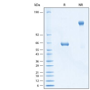 2 μg/lane of Recombinant Human ULBP-2 Fc Chimera Avi-tag Protein (Catalog # AVI1298) was resolved with SDS-PAGE under reducing (R) and non-reducing (NR) conditions and visualized by Coomassie® Blue staining, showing bands at 60-70 kDa and 120-140 kDa, respectively.