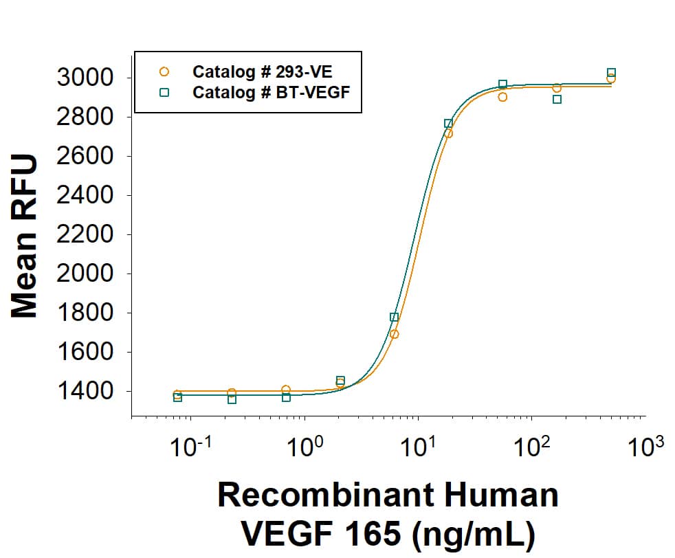 Recombinant Human VEGF165(Catalog # 293-VE) stimulates proliferation in HUVEC human umbilical vein endothelial cells. The ED50 is 1.50-12.0 ng/mL.Recombinant Human VEGF 165 Protein Bioactivity Comparison.