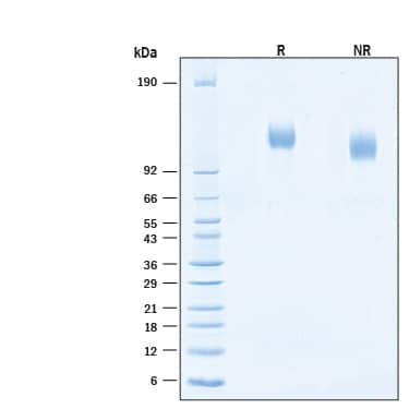 2 μg/lane of Recombinant Human VEGFR2/KDR His-tag Protein (Catalog # 10964-KD) was resolved with SDS-PAGE under reducing (R) and non-reducing (NR) conditions and visualized by Coomassie® Blue staining, showing bands at 114-126 kDa.Formulation, Preparation and Storage