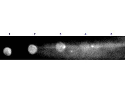 Dot Blot results of Goat Goat anti-Rabbit IgG Fc Secondary Antibody [Rhodamine] (Pre-adsorbed). Dots are Rabbit IgG at (1) 100ng, (2) 33.3ng, (3) 11.1ng, (4) 3.70ng, (5) 1.23ng. blocking for 30 min at RT. Primary Antibody: none. Secondary Antibody: Goat Anti-Rabbit IgG F(c) FITC at 1ug/mL for 1hr at RT. Imaged with BioRad ChemiDoc, Rhodamine filter.Applications for Goat anti-Rabbit IgG Fc Secondary Antibody [Rhodamine] (Pre-adsorbed)