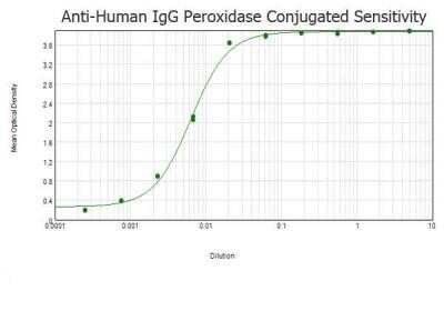 ELISA: Goat anti-Human IgG (H+L) Secondary Antibody [Unconjugated] [NBP1-72710] - ELISA results of purified Goat anti-Human IgG Antibody Peroxidase conjugated tested against BSA-conjugated peptide of immunizing peptide. Each well was coated in duplicate with 1.0 ug of Human IgG. The starting dilution of antibody was 5 ug/ml and the X-axis represents the log10 of a 3-fold dilution. This titration is a 4-parameter curve fit where the IC50 is defined as the titer of the antibody. Assay performed using 3% fish gelatin as a blocking buffer and TMB substrate. Image from the HRP version of this antibody.