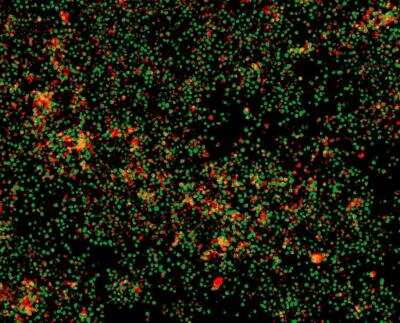 Cellular Imaging: Propidium Iodide [NBP2-31155] - MDA-MB468 cells stained with Live green dye (Calcein) and dead PI dyes (red) after 5 days of drug treatment. Image from verified customer review.