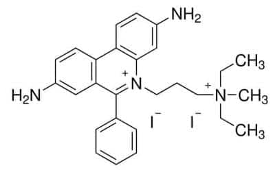 Fluorescent stain for nucleic acids. Cell membrane integrity excludes propidium iodide from staining viable and apoptotic cells. Propidium iodide may be used in flow cytometry to evaluate cell viability when used with other dyes that stain viable cells or cells that are early in the apoptosis process.