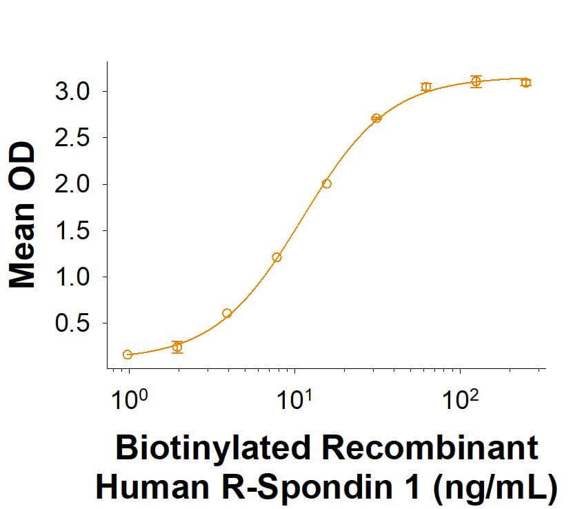 R-Spondin 1 (RSPO1), also known as Cristin 3, is a 27 kDa secreted protein in the R-Spondin family of Wnt/beta-catenin signaling regulators. R-Spondin 1 enhances canonical Wnt/beta-catenin signaling by competing with the Wnt antagonist Dkk-1, binding to Frizzled-8, Kremen, LRP-6, Lgr4, Lgr5, and Lgr6, and enhancing cell surface availability of Wnt receptors. R-Spondin 1 functions in dorsal neural tube development as well as male and female germ cell development. It also induces bone formation, intestinal crypt cell proliferation, angiogenesis, and insulin secretion from pancreatic beta cells.