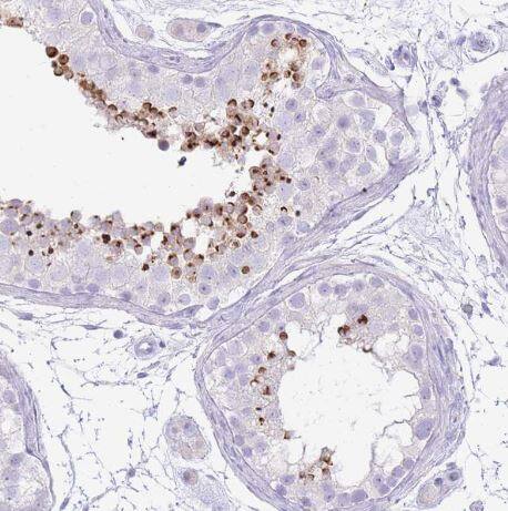 Staining of human testis show strong extracellular space and nuclear positivity in subset of cells in seminiferous ducts.Staining of human liver shows no positivity in hepatocytes as expected.
