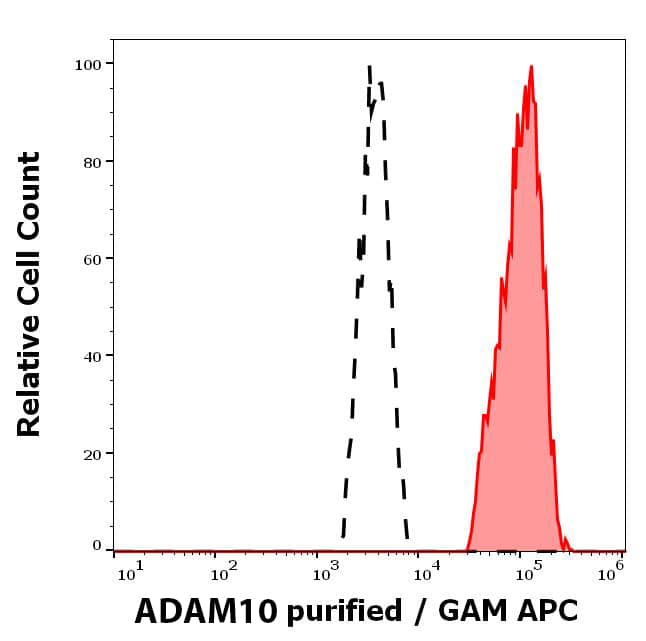 Separation of human monocytes stained using anti-human ADAM10 (11G2) purified antibody (concentration in sample 1.67 ug/ml, GAM APC) from human monocytes unstained by primary antibody (GAM APC, black-dashed) in flow cytometry analysis (surface staining).Applications for ADAM10 Antibody (11G2) - BSA Free