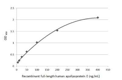 Sandwich ELISA: Apolipoprotein E/ApoE Antibody (GT27711) [NBP3-13692] - Sandwich ELISA detection of recombinant full-length human apolipoprotein E using Apolipoprotein E/ApoE antibody [GT27711] (NBP3-13692) as capture antibody at concentration of 5 ug/mL and Apolipoprotein E/ApoE antibody [C2C3], C-term as detection antibody at concentration of 1 ug/mL. Rabbit IgG antibody (HRP) (NBP2-19301) was diluted at 1:10000 and used to detect the primary antibody.