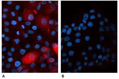 Immunocytochemistry/Immunofluorescence: beta 2-Microglobulin Antibody (B2M-01) [Biotin] [NBP1-44521] - Human beta-2-microglobulin-transfected canine cells labeled A) with B2M-01 antibody Alexa Fluor (R) 647 conjugate and B) with Alexa Fluor (R) 647 conjugated Mouse IgG2a Isotype Control . Cells were fixed with 4% PFA and permeabilized with 0.1% PBS-Tween20 containing 2% BSA. Antibody concentration 2ug/ml.